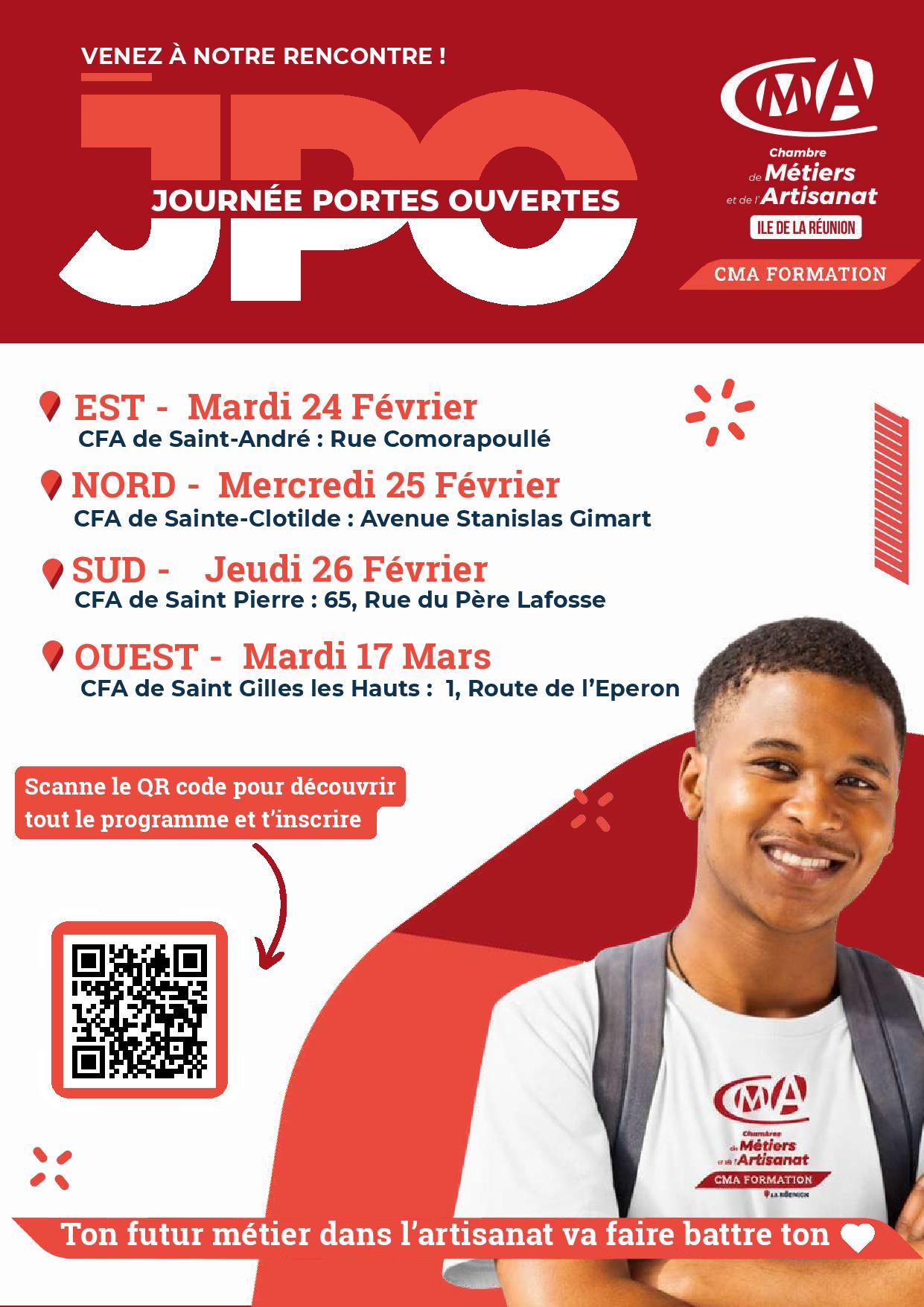 Le CFA CMA Formation organise plusieurs Journées Portes Ouvertes sur l’île afin de vous permettre de découvrir les formations et les métiers de l’artisanat.