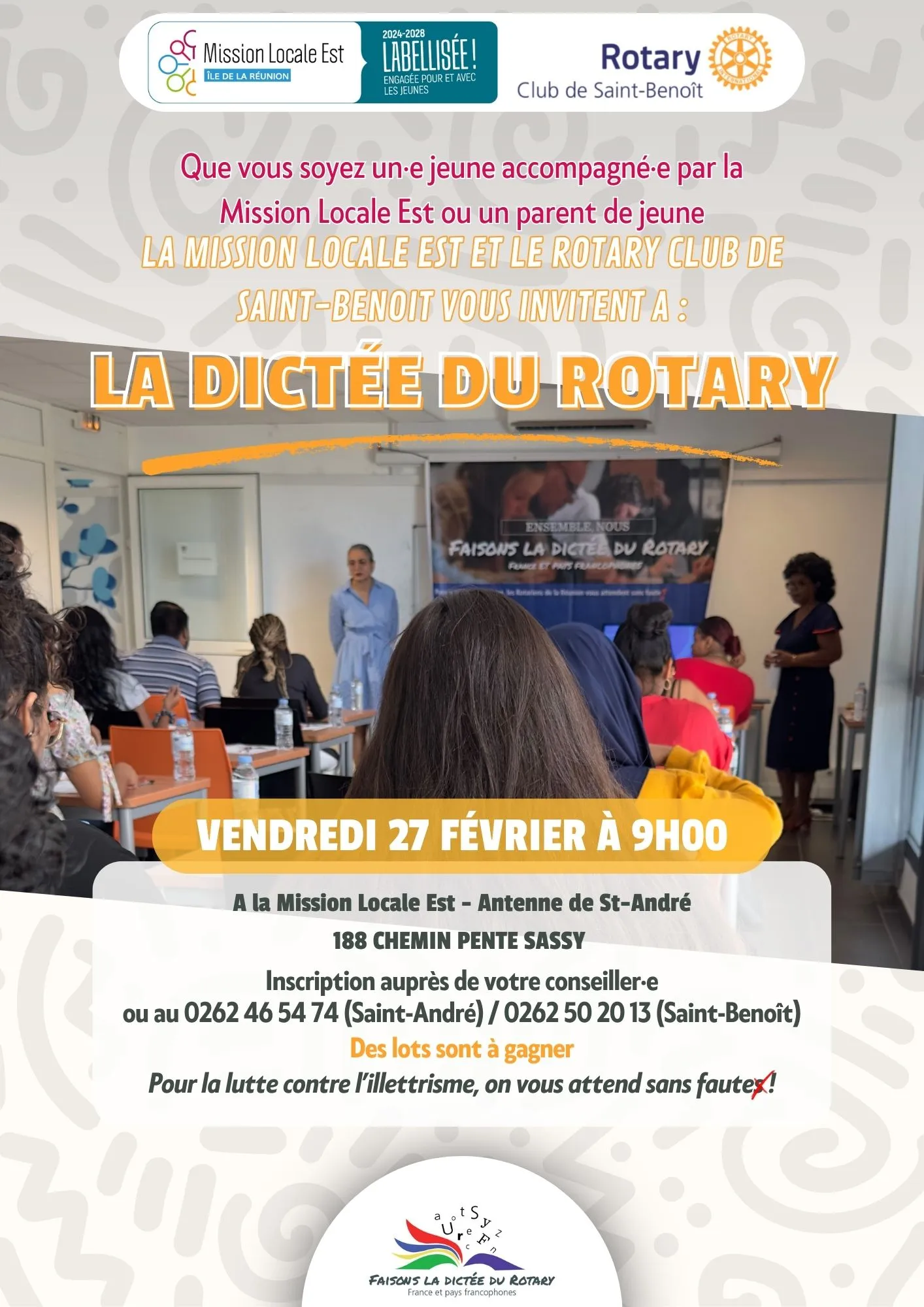 👉 La Dictée du Rotary est l’occasion de conjuguer apprentissage, engagement citoyen et convivialité autour d’un événement fédérateur. La Mission Locale Est et le Rotary Club de Saint-Benoît vous y attendent nombreux.