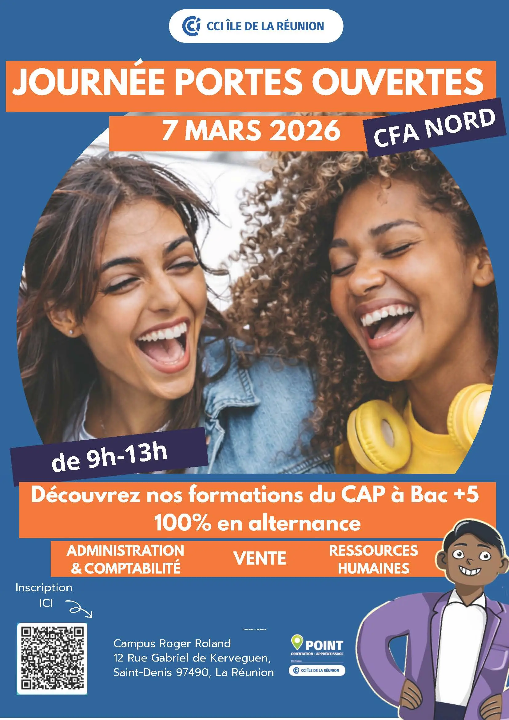 La filière tertiaire Nord de la Chambre de Commerce et d’Industrie organise une Journée Portes Ouvertes le samedi 7 mars 2026, de 9h à 13h, au Campus Roger Roland – 12 rue Gabriel de Kerveguen à Sainte-Clotilde.